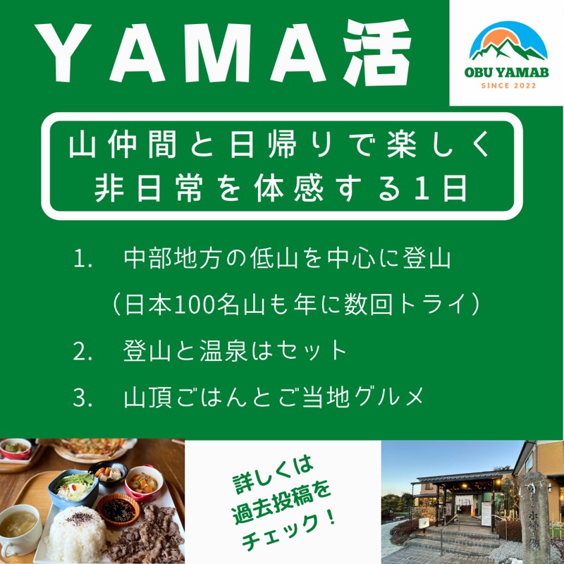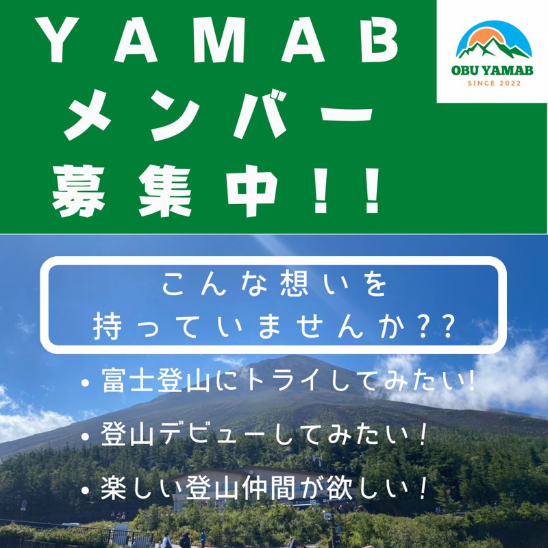 | 連絡事項や アピールポイント | ☆☆☆LINE公式アカウントはじめました☆☆☆ ・お問い合わせや連絡にお使いください♪ ・今後の企画や活動実績などを発信します♪ ・直近の予定を知りたいかたは、登録お願いします! ⇒ https://lin.ee/W7Muz84 ⇒ ID:@839bhabq 【今後のYAMA旅・予定】 11月9名(日) 霊仙山:定員6名 12月14日(日) 春日井三山or各務原アルプス 【参加希望のかたへ】 ☆50代以上のかたは、ご遠慮いただいております。 (年齢バランスを保つためです) ☆初心者のかたは、他のサークルをオススメします。 (初心者=1000m級以上の登頂経験がないかた) ☆上級者のかたは物足りないので、他のサークルをオススメします。 (上級者=1人でアルプス山行計画を立てられる方) ☆初級者から中級者を目指すかたは、当サークルをオススメします。 (当サークルは、リーダー含め中級者中心のメンバーの集まりです) 【2025年 YAMA旅・実績】 11月2日(日) 金勝アルプス:5名(新規ゲスト:1名) 10月25日(土) 白草山:4名(新規ゲスト:1名) 9月28日(日) 白馬大池:8名 9月7日(日) 天蓋山(岐阜県):3名(新規ゲスト:1名) 8月23-24日 テント・小屋泊(硫黄岳・横岳・天狗岳):8名 8月16日(土) 焼岳(長野県):3名 8月1日(金) 燕岳(長野県):4名 7月21日(月) 栗沢山(山梨県):3名 7月13日(日) 乗鞍岳(岐阜・長野県):9名 6月22日(日) 竜ヶ岳(山梨県):6名 6月1日(日) 便石山(三重県):7名(新規ゲスト2名) 5月25日(日) 六甲山(兵庫県):9名(新規ゲスト1名) 4月27日(日) 富士見台高原(岐阜県):4名 3月30日(日) 百々ヶ峰(岐阜県):14名(新規ゲスト:9名) 3月2日(日) 長者ヶ岳(山梨県):3名 2月23日(日) 金剛山(奈良県):7名 1月19日(日) 入笠山(長野県):9名(雪山デビュー4名) 【2024年 YAMA旅・実績】 12月30日(月) 黒斑山(長野・群馬県):4名 12月22日(日) 権現山・遠見山(岐阜県):10名 12月1日(日) 剣山(愛媛県):6名 10月27日(日) にゅう(長野県):6名(新規ゲスト1名) 10月13日(日) 釈迦ヶ岳(三重県):11名(新規ゲスト3名) 9月29日(日) 霊仙山(滋賀県):6名(新規ゲスト1名) 9月15日(日) 御嶽山(岐阜・長野県):5名(新規ゲスト1名) 8月24・25日 テント泊・八ヶ岳(赤岳・阿弥陀岳):5名 8月12日(祝) 南沢山・横川山(長野県):7名(新規ゲスト3名) 7月28日(日) 金時山(神奈川県):6名(新規ゲスト2名) 5月26日(日) 鎌ヶ岳(三重県):6名 4月28日(日) 入笠山(長野県):5名(新規ゲスト1名) 3月24日(日) 北横岳(長野県):3名(新規ゲスト1名) 1月14日(日) 猪臥山(岐阜県):6名 【YAMABメンバー募集】 「いつか富士登山にトライしてみたい」 そんな想いから始め、 集まった登山仲間のグループです。 まったくの初心者の集まりから、 経験者のアドバイスを聞き、 低山を中心に月1ペースで 登山を重ねてきました。 2021年夏に念願の 富士山登頂は叶いました。 ただ富士山だけでなく、 登る山々の絶景・魅力にハマり、 各地の温泉・グルメも味わう中で、 もっとたくさんの登山仲間と一緒に 楽しく日本各地を巡りたいと思い、 今回メンバー募集することにしました。 【OBU YAMABとは?】 メンバーのほとんどが愛知県大府市に 縁のある方ばかりのグループで スタートしました。 (現在は、大府以外のメンバーが増えてます) 登山・山行という言葉の 「危険・キツイ・つらい」という イメージと堅苦しさが 少しでも和らげばと、 呼びやすい名称を考えました。 また登山アプリ「YAMAP」さんを 愛用していることにも掛けています。 (プラン作り・登山中に活用しています。) 【YAMA旅】 ☆ 登山+温泉+ご当地グルメを楽しむ活動 参加メンバー状況に応じて、 毎月 登山プランを作成します。 登山後のお楽しみに、 温泉とご当地グルメも 満喫できるプランを企画。 詳しくは、 Instagram(obu_yamab2022) 投稿をご覧くださいね。 (フォローうれしいです!) 参加費は参加メンバーで割り勘となります。 ※交通費(ガソリン・高速・駐車場・車両代) ※食事・温泉・公共交通機関・保険は各自負担 【OBU YAMAB参加メリット】 ☆ 旅気分も楽しめる登山プラン メインは日帰り登山プランですが、 年に1度は、宿泊をともなったプランも企画。 行きたかったあの場所に、 登山仲間と行けるチャンスが増えますよ♪ ☆ 参加者全員でアルバム共有 登山後はグループLINEで写真・動画を共有します。 あなたの思い出づくりやSNS投稿にも活用できます。 ☆ 新しい出会いと発見 メンバー全員、職業バラバラです。 プライベートや仕事などの悩みや 普段言えないことなど 相談してみてはいかがでしょうか。 新しい気づきや発見が 生まれるかもしれませんよ♪ 【一緒にYAMA旅たのしみましょう!】 日本の美しい絶景の中、 楽しい登山仲間と一緒に 日本各地を巡りましょう♪ わたしたちと一緒に 登山してみたい方の メッセージお待ちしております♪ 【よくあるご質問】 Q. 大府に関係していないと参加できませんか? A. 関係なくても大丈夫です! Q. 車を持っていなくても大丈夫ですか? A. 大府市にお住まいの方に関しては、送迎可能です! (それ以外のお住まい方で送迎希望の方は、要相談) 【参加方法】 まずは気軽に コメント・お問い合わせ メッセージお待