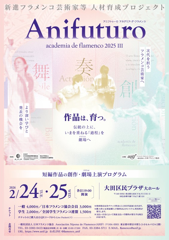 | 連絡事項や アピールポイント | 世界初! 「フラメンコ・ミュージカル」を製作いたします。 本邦初公開が決まりました! 2026年2月25日(水)、太田区民プラザ大ホールにて上演いたします。([「日本フラメンコ協会」主催「Anifuturo(新進フラメンコ芸術家等人材育成プロジェクト)」における短編作品の創作・劇場上演プログラム)に採択され、2/25(水)に20分という持ち時間ではありますが、本来は2時間ほどかかる内容ですがギュッと凝縮して上演いたします。 「フラメンコ・ミュージカル」発起人は、元ミュージカル女優(「東宝製作「ゾロ・ザ・ミュージカル」に日本人唯一のフラメンコ・ダンサーとして出演)で現フラメンコ・パフォーマー(2016年、日本におけるフフラメンコのオリンピックにあたる「フラメンコ・ルネサンス」にて金メダルに該当する奨励賞受賞 )の大野環。 ミュージカル演出家・奥村達夫氏とタッグを組んで、フラメンコ・ミュージカル「EVITA」製作上演するにあたり、 この作品に出演されたい方を募集いたします! フラメンコの要素が入ってきますので、フラメンコ未経験者の方にはまず「フラメンコの基礎」を学んでいただき、それを生かした振付を進めていきます。 今回の上演で、実際にどのような作品なのかをかいま見て頂く事ができます。 「EVITA」は、主要キャストが少ない分、アンサンブルのパワーが軸となります。 今回の上演ではアンサンブルは登場しませんが、「ああ、本編ではここでアンサンブルが登場するんだな・・・」というように、お分かりいただけると思います。ぜひ、どのようなことを目指す作品なのか、目撃しにいらしてください。この日本フラメンコ協会主催のAnifuturo(新進フラメンコ芸術家等人材育成プロジェクト)」における短編作品の創作・劇場上演プログラム)にエントリーするだけでも、様々な条件があり、狭き門となっております。(他に2日間の公演で11組の出演がありますが、どれもその狭き門をくぐってエントリーされた方々ですので、見応えがあると思います)ご鑑賞代も、劇場公演としてはお求めやすい料金となっております。 2026年、2月25日(水)18:30開場 19:00開演 日本フラメンコ協会主催「ANIFUTURO~短編作品の創作・劇場上演プログラム~」(太田区民プラザ大ホール) チケット:一般¥4,000/日本フラメンコ協会会員¥3,000 学生¥2,000/全国学生フラメンコ連盟¥1,500 メッセージでご連絡いただければ、「電子チケット」となっておりますので、 「フラメンコ・ミュージカル」というからには 唄や演技に加え、「フラメンコ」も習得していただく必要がありますので、 フラメンコが初めての方には、まずはその基礎から始めていただき、 逆にフラメンコ経験者の方には、 唄や演技の習得をしていただきますが その両方の経験を持ち、 東宝ミュージカル「ZORRO the Musical」にも、日本人唯一のフラメンコ・ダンサーとして全公演出演した大野環が 丁寧に、「フラメンコ」の基本を指導させていただきますので、ご安心ください! また、「EVITA」はアンドリュー・ロイド・ウェバーの作品として有名ですが、 労働者たちや軍人・貴族階級を迫力あるフラメンコ要素を加えた群舞で表現したら、めちゃくちゃカッコいい舞台になります! その「世界初」の舞台に、あなたも関わってみませんか? 出演・配役は、最終的にはオーディションとなりますが 出来るだけ、出演希望の方は合格させてあげたい所存ですが、 万が一このオーディションに受からなかった場合も このシリーズは、今後も継続していきますので 次の作品、に出演できる可能性も十分にあります。 「諦めない」「コツコツやる」方を、希望いたします! まずは、「専用HP」で 詳細をご覧ください! https://www.el-anillo.jimdosite.com/ 参加費・必要な物等もそちらに明記してございます。 「お問合せ」も、お気軽にどうぞ! |