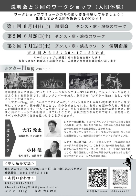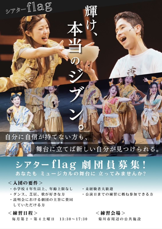| 連絡事項や アピールポイント | 「シアターflag」は、“私はここにいるんだ。”という自分にしかない旗を掲げることを大切にしています。旗を掲げることで、自分を好きになれる。お互いを認め合える。それがこの劇団の原点です。一人一人が、歌・ダンス、そして演技等の舞台表現の基礎を磨き、仲間と共にミュージカルを創り上げていくことで、表現力豊かな方だけでなく、志を持ったすべての方が輝く自分を見つけることができます。 ワークショップの募集は現在行っておりませんが、ご連絡いただければ、通常の稽古の見学、体験も可能です。 |