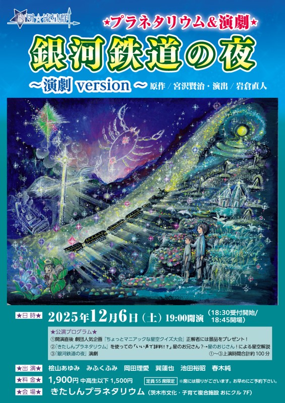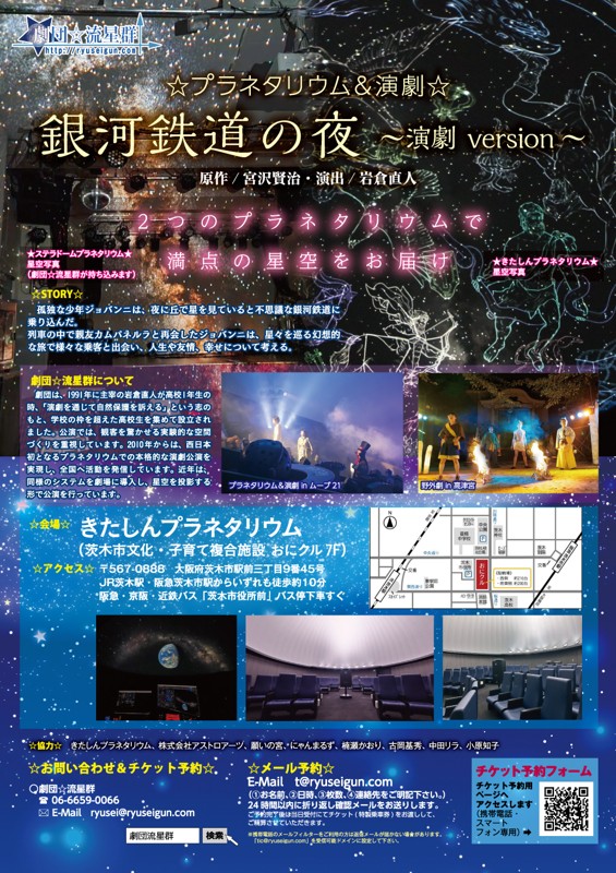 | 連絡事項や アピールポイント | 劇団☆流星群 劇団員・レッスン生募集 あなたの“光”を、星空の物語で輝かせてみませんか? ― プラネタリウムで演劇を創る、日本でも希少な劇団 ― 劇団☆流星群では、次回公演に向けて新しい仲間(劇団員)を募集しています。 当劇団は “星空の下で物語を届ける” をコンセプトに、プラネタリウムを舞台とした演劇活動をしています。 満天の星空、360°に投影するプラネタリウム。通常の劇場では味わえない特別なステージを創り続けています。 ■ 活動の特徴 ✦ ① プラネタリウムという特別な舞台 星空を背景に立つ、唯一無二の演技体験。 星空の光や映像と連動した演技は、役者としての新しい表現の可能性を広げることもできます。 ✦ ② 役者としての “外部仕事” が増加 近年、劇団員の活躍の場が広がり、 ショートドラマ広告、SNS向けPR動画、企業CM風短編作品など、映像出演の依頼が増えています。 役者として実績を積みたい方にとって、大きなチャレンジの場があります。 ✦ ③ 初心者OK・経験不問 基礎レッスンから丁寧にサポート。演技未経験の方も歓迎します。 ✦ ④プロとして必要な演技術・発声術が学べる プロとして必要な演技術・発声術を短期間でお教えします。 直径18mのプラネタリウムドームでもマイクを使わない発声技術を持っています。 ■ 募集内容 対象:16歳~60歳程度 経験:不問(初心者歓迎) 活動:稽古/プラネタリウム公演/各種ショートドラマ・広告出演 勤務地:大阪府内(北摂エリア中心) ■ こんな方を歓迎します ☆プラネタリウムという特別な空間で演じてみたい ☆舞台だけでなく、映像の仕事にも挑戦したい ☆新しい表現やエンタメに興味がある ☆人に感動を届けたい ■ 応募方法 公式サイトの募集ページよりご応募ください。 https://ryuseigun.com 稽古見学やご質問も歓迎しています。 Eメール:ryusei@ryuseigun.com 担当:劇団☆流星群 岩倉直人 |