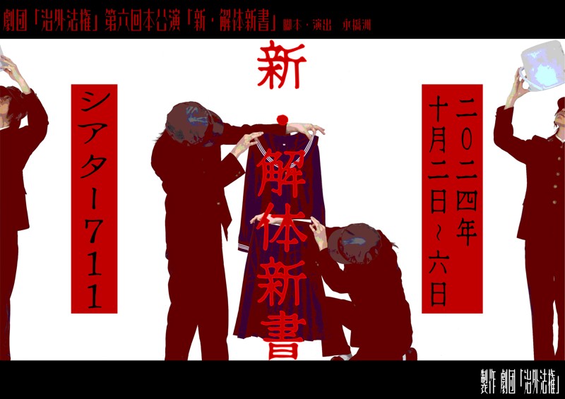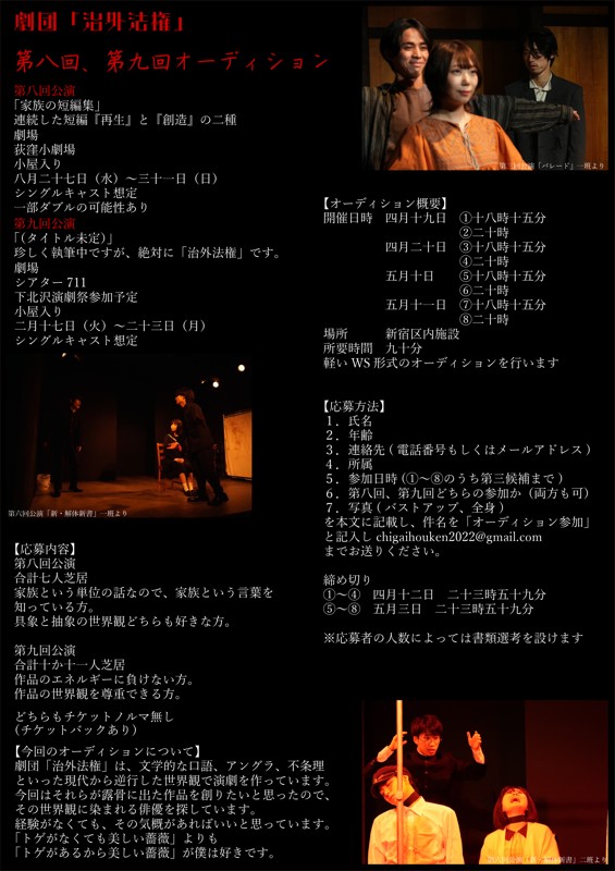 | 連絡事項や アピールポイント | ・劇団「治外法権」でしか得られない栄養を創作。 ・アングラ、古典、文学古き良き文化を大事にしたエネルギーのある演劇。 ・0からでも1からでも、実力をつけてから舞台に臨みます。 応募フォーム(こちらあるいは下部に記載したメールアドレスに応募できます) https://docs.google.com/forms/d/1uNfSvIg2MqJE_mH-zGtyyNOZaCXsXXk3wCYtjmhpysI/edit?usp=drivesdk ※稽古見学、オンライン相談も可 ◆簡単な劇団「治外法権」 ・エネルギー量高めの舞台 ・初心者でも全力さえ出せれば問題なし ・宣材写真撮影、音響照明舞台監督全て劇団内で完結 ・どんな相談にも乗れる ◆劇団「治外法権」について 劇団「治外法権」は文学的な口語、アングラ、不条理といった、現代から逆行した世界観で演劇を創っています。 その創作を共にできる方を探しています。知識や経験はいりません。僕の持っている全てを教えます。 ▼主な実績 第一回公演 2022年6月「踊り踊らされ短編集」北池袋新生館シアター 第二回公演 2023年3月「件の短編集」荻窪小劇場 第三回公演 2023年8月「パレード」下北沢OFF・OFFシアター 第四回公演 2023年12月「見えない短編集」アルネ543 第五回公演 2024年3月「額縁の短編集」新宿眼科画廊 第六回公演 2024年10月「新・解体新書」下北沢シアター711 第七回公演 2025年3月「鬱文通」下北沢OFF・OFFシアター 第八回公演 2025年8月「家族の短編集」荻窪小劇場 第九回公演 2026年2月「死滅回遊」下北沢シアター711(下北沢演劇祭参加作品) ★募集対象・歓迎する方 対象:経験不問・18歳以上(高校生不可) 歓迎する方: ・アングラ、エネルギーが溢れる舞台が好きな方 ・体、声、全てを使って表現したい方 ・自分の強みを活かせる方 ・劇団を信用できる方 募集ロール 俳優/声優/モデル/映像/作曲/照明/制作/大道具/衣装メイク ほか (1つから複数でもOK) ※大学生・未経験・ブランクあり歓迎 ■活動内容・稽古について 場所:東京都新宿区近辺の区民施設を中心に利用 稽古頻度 月1〜2のWS稽古(劇団員の希望があれば複数回も可) 本番前は週3〜5(出演の場合) ※学業・仕事との両立はご相談ください ▼応募の流れと方法 書類→面談(またはオーディション) ※稽古見学・体験のお問い合わせもお待ちしてます 応募方法 上部にある応募フォームもしくは ・名前 ・写真(顔+全身。スマホ撮影OK。過度な加工NG) ・志望動機 ・活動歴(未経験の場合「劇団員としてどう活動したいか」をご記入ください) 上記をご記入頂き chigaihouken2022@gmail.com にお送りください。 お問い合わせ chigaihouken2022@gmail.com X(旧Twitter)@chigai2022 ★主宰より最後に 劇団「治外法権」主宰の永橋洲です。 舞台は自由です。全てが解放されるべき場所だと思っています。 舞台上も、裏で支える方も、全力で取り組むべきだと思っています。 苦しみも悲しみも全て「面白い創作物」として昇華してみませんか? |