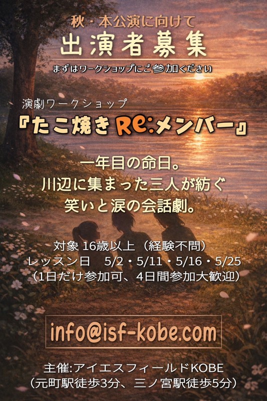 | 連絡事項や アピールポイント | 立ち上げメンバー募集! 「役者になりたい」「舞台に立ってみたい」その夢、神戸で叶えませんか? 映画・演劇界を牽引するアイエスフィールドグループが、新たに**『アイエスフィールドKOBE』**を設立! オープニングメンバーとして、共に歩む所属俳優・新人俳優を募集します。 • 未経験者、大歓迎! 基礎から学べる環境です。 • 15歳以上なら性別不問。 • 入会金不要! 始めやすさも魅力です。 映画のエキストラから配役付きの出演まで、チャンスは無限大。 まずは説明会でお会いしましょう! ◾️ワークショップ 5/2 、5/16 土曜14:00〜16:00 5/11、5/25 月曜19:00〜21:00 ◾️説明会 5/2、5/16 土曜16:00〜 16:00~16:10 受付 16:15~17:00 説明会 5/11、5/25 月曜21:00〜 21:00〜21:10 受付 21:15〜22:00 説明会 ◾️稽古参加者特権 映画や舞台等のエキストラ〜役付き出演 (報酬あり) ■初期メンバー所属 入会金不要、月謝20000円 ◾️応募方法 ①お名前(本名) ②希望の芸名(ない方は空白でok) ③電話番号 ④メールアドレス ⑤芸歴(無い方は空白でok) ⑥説明会希望日(上記日程より選択) ⑦ワークショップ参加希望しますか? (※五月のワークショップは土曜2回or月曜2回をお選びいただきます。片方だけですと、見学になります。2回ご参加の方は、参加費10000円をご持参ください。見学の方は無料です。途中参加も可能です) ⑧質問など ◾️説明会への持ち物 ①筆記用具 ②土足禁止の場所なので、裸足が嫌な方はスリッパ ◾️応募の返信について 3日以内に、説明会の開催場所をお知らせいたします。 当日の連絡先もお知らせします。 質問などは説明会にて回答いたします。 ご不明点は、できる限り返信にて回答いたします。 ◾️HP https://isf-k.com/ まずは説明会にお気軽にお越しください。 最後までお読みいただきありがとうございました。 |