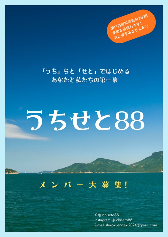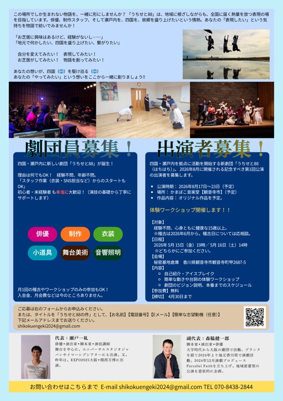 | 連絡事項や アピールポイント | 四国・瀬戸内に新しい劇団「うちせと88」が誕生! 理由は何でもOK! 経験不問、年齢不問。 「スタッフ作業(衣装・SNS担当など)からのスタートもOK」 初心者・未経験者 も大歓迎(演技の基礎から丁寧にサポートします)! 俳優以外にも脚本•演出に挑戦してみたい方もご応募ください! 月1回の稽古やワークショップのみの参加もOK! 入会金、月会費などは今のところありません。 ※2026年8月に第1回公演を行います。出演者も同時募集しています。 公演時期: 2026年8月17日~23日(予定) 場所: かまぼこ音楽堂【観音寺市】(予定) 作品内容: オリジナル作品を予定。 体験ワークショップ開催します!! 【対象】 経験不問、心身ともに健康な15歳以上。 ※稽古は2026年6月から。稽古日については応相談。 【日程】 2026年 5月 15日(金)19時/ 5月 16日(土)14時 ※どちらかにご参加ください。 【会場】 秘密基地倉庫 香川県観音寺市観音寺町甲2687-5 【内容】 自己紹介・アイスブレイク 簡単な動きや台詞の体験ワークショップ 劇団のビジョン説明、本番までのスケジュール 【参加費】無料 【締切】 5月15日まで |