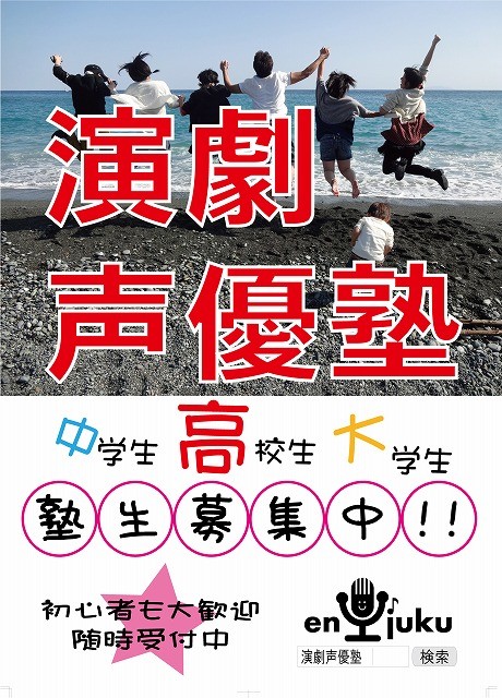 | 連絡事項や アピールポイント | ■ 演劇や声優の「上達方法」や「練習方法」を学びたい人 ■ ◆◆◆◆◆◆◆◆◆◆◆◆◆◆◆◆◆◆◆◆◆◆◆ あなたは演劇界声優界の氷山の一角になれますか!? 高い月謝を払って進んだ専門学校も 学校であって業界ではないんです! 実は業界で求められるのは、基礎と実力だけ! 本気の方、やる気のある方 くじけない方だけが渡ることのできる橋 はじめは誰もその橋を渡るのは怖いと思うはずです。 でも!! その橋を渡った人だけ 自分のやりたいものを手にすることが出来るんです! 初めてとか、経験したことあるとか そんなことは関係ないんですよ!! 「来る者は拒まず 去る者は追わず」 ただ…その橋を渡れるかなんです。 ◆◆◆◆◆◆◆◆◆◆◆◆◆◆◆◆◆◆◆◆◆◆◆ << 演劇声優塾とは >> 部活やサークル、小演劇では学べない 「役者としての上達方法」 「舞台の知識」 「プロの裏方スタッフによる講習と実技」 を教えています。 <誰も教えてくれない>基礎とテクニックを学ぶ「塾」なんです ------------------------------------------------------ << 稽古内容 >> 【 演劇基礎 】 今までみなさんがされてきた基礎ではない、本当の基礎訓練 発声・発音・呼吸法・身体訓練・音感・身体感覚・ダンスを主におこないます。 【 演技基礎 】 演技とは作るものではない、そう本当に思える真の演技訓練 エチュードの基礎やショートショートをおこないます。 【 演劇声優実技 】 より実践的な実技訓練 基礎内容をさらに追求した実践的な稽古と、レコーディングを目的とした稽古をおこないます。 ------------------------------------------------------ << 応募要項 >> ○未経験でも本気で取り組める方 ○西武池袋線大泉学園駅からの稽古場に参加できる方 ○携帯やパソコン等メールでの連絡が取れる方 ※応募要項が変更になる場合がありますので、詳細はホームページ上でご確認ください! ------------------------------------------------------ << クラス詳細 >> 【基礎クラス】 毎月第2日曜日の9時から17時まで ※他の週の日曜日になることもあります。 演劇基礎と演技基礎稽古をおこないます。 ◆参加費◆ 中高生(18歳まで)は1回500円 その他は1回1000円 タイムテーブル例) 9:00~10:00 着替え、アップ 10:00~10:45 筋トレ、ランニング 10:45~11:30 呼吸法、発声法 12:30~13:00 アップ 13:00~15:00 朗読 15:00~16:30 即興・ショートショート 16:30~17:00 着替え、清掃、退館 【応用クラス】 毎週水曜日夜18時半から21時半まで 基礎内容を更に追求した稽古をおこないます。 ※「基礎クラス」からの希望者のみになりますので、応用クラスのみの参加は受け付けておりません。 ◆参加費◆ 中高生(18歳まで)は1回100円 その他は1回200円 タイムテーブル例) 18:30~19:00 着替え、柔軟 19:00~20:00 殺陣、ダンス 20:00~21:20 レコーディング 21:20~21:30 着替え、退館 【実践クラス】 毎月第4日曜日の9時から17時まで ※他の週の日曜日になることもあります。 実践演技を中心とした稽古をおこないます。 ◆参加費◆ 中高生(18歳まで)は1回500円 その他は1回1000円 タイムテーブル例) 9:00~10:00 着替え、アップ 10:00~10:45 筋トレ、ランニング 10:45~11:30 作品打ち合わせ 12:30~13:00 読み合わせ 13:00~15:00 レコーディング 15:00~16:30 レコーディングチェック・ダメ出し 16:30~17:00 着替え、清掃、退館 ------------------------------------------------------ 演劇声優塾 ホームページ https://www.office-cannabis.jp/engekiseiyuujuku/ 稽古場ブログ http://seiyujuku.seesaa.net/ すぎさんの制作日記 http://ameblo.jp/office-cannabis/ |