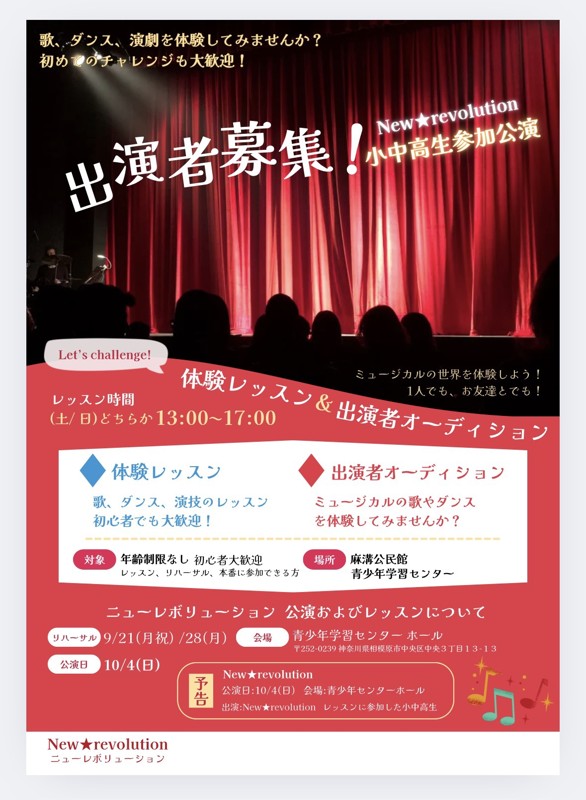 ニューレボは皆さんが楽しくレッスン出来るサークルを目標としてますので、演技・ダンス・歌の経験がまったくなくても大丈夫です。