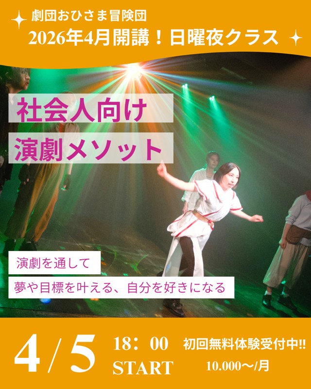 | 連絡事項や アピールポイント | ☆やってみたい!その思いだけで充分☆ 2026年4月5日新START!1 社会人向け演劇メソット新コース開設!! 初回無料体験! 【社会人のための日曜表現クラス】です。 ※会社員の方限定とういうことではありませんので、お希望の方はお問合せくださいませ。 このクラスは、ただ演技を学ぶためだけの場ではありません。 演技、身体表現、対話、そして算命学の視点も交えながら、自分を見つめ直し、心と身体を少しずつひらいていくための新しい学びの場です。 「心で感じたことを、身体や表現の中で少しずつ動かしていく」 そんな実践の場を作りたいと思いました。 演技経験は必要ありません。 むしろ、演劇は初めてという方にこそ来ていただきたいクラスです。 安心できる場の中で、 少し身体を動かす。 少し声を出してみる。 少し自分の気持ちに気づいてみる。 そんな時間を重ねることで、 止まっていたものが少しずつ流れ始めることがきっとあるはずです! ーーーーーーーーー 初めまして、当劇団のページを開いてくださりありがとうございます‼️‼️ 代表のたまゆり笑です!! 女性が多く在籍しています💛 明くて元気な女性大募集です‼️‼️ おひさま冒険団の事をつらつら書いてありますので、気になる方は最後まで覗いていただけると幸いです🌻 演劇×社会貢献×本気の自分磨き ──そのすべてを体験できる場所が、ここにあります。 劇団おひさま冒険団は、2025年11月で13年目。 干支も一周し、今、次のステージへ進む仲間を募集しています。 私たちはただの“演劇サークル”ではありません。 表現と社会をつなぐ新しい形の劇団です。 募集メンバー 🔆お芝居出来る場所を探している方。 🔆サークルを探している方。 ➡️私は大学の頃人に馴染めなくて、サークルに入りそびれました… そんな人でもココなら仲間を作れるかも。是非少しの勇気を✨ 🔆新しい事にチャレンジしようと思っている方。 🔆これまでの殻を破りたい方。 🔆営業スキルをアップさせたい方。 などなど… このページを訪れてくださった方の思いは様々あると思います。 是非、おひさま冒険団で、私たちとその思いを分かち合いませんか? 🌈これまで体験に来てくれた方からの声 ・アットホーム!!いい意味で厳しくあり、自分を成長させてくれる場所だと思った。 ・最初は空気が緩いな~と思った、笑。でも、やる時はやる!切り替えがある。 ・とにかく動く!久しぶりにこんなに動きました!!明日筋肉痛です… 🌈メンバーはこんな思いではいりました! ・自分も舞台に立ちたい!ミュージカル大好きなSちゃん。 ・一度は芝居から離れたけれど、やっぱりお芝居がしたい!と勇気を出したHちゃん ・憧れの人のように、感動を与えられる人になりたいS君 ・子どもたちが笑顔で暮らせる世の中で会ってほしいという思いその手段として演劇を選んだ、私🐥 🌈おひさま冒険団の特徴 地域活動に積極的に関わる 👉拠点となっている、中野区への感謝。お芝居のような芸術は人々の心や生活が豊かあるからこそ触れてもらえるものだと考えます。だから地域活動を通して少しでも地域の人のお役に立てるよう活動しております。そして地域での劇団ファンづくりも兼ねているのです😆 主催イベント:中野通りさくらのお礼肥え(5月)、哲学堂ちびっこオセロ大会(秋) ✨演劇を通じて、新しい自分に出会える場所。それが劇団おひさま冒険団です。✨ まずはお気軽にご連絡ください! 📅 稽古日:毎週木曜日又は日曜日&第2・第4月曜日 18:00~22:00 📍 稽古場:東京都中野区周辺 🎒稽古持ち物:室内運動靴、着替え、タオル、飲み物、筆記用具 🏃➡️稽古内容:筋トレ、ダンス、アクション、殺陣、芝居、座学 🎭 公演:年2~3回の劇場公演に加え、地域イベントやレストラン公演など 💰 劇団費:1万円/月 最低6回/月のレッスンを保証(講師代・稽古場代・劇団運営費含む)スポーツ保険200円/年 ※木曜日、日曜日両曜日希望の方は15,000円/月 ホームページ(稽古日記)、各SNS随時更新中‼️‼️‼️ 覗いてみてくださいね😎 沢山の仲間に会えるのを楽しみにしております🤚 お気軽にメッセージください📧 代表 たまゆり笑 |