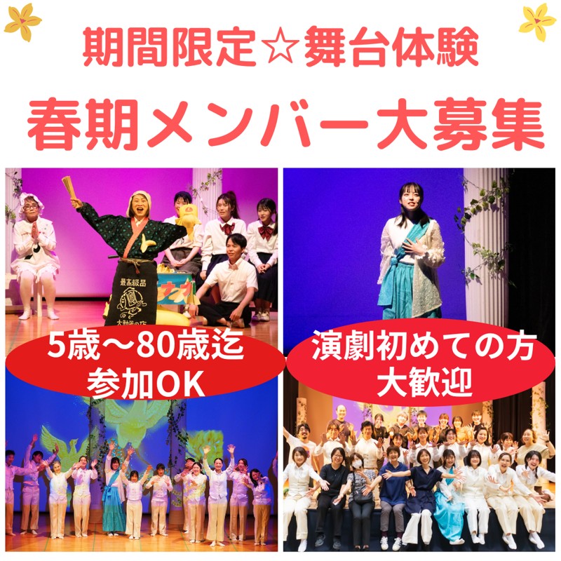 | 連絡事項や アピールポイント | 観る側から演じる側へ 新しい一歩を踏み出すチャンス! やってみたい!が参加条件! あなたも舞台の上でもう一人のあなたを見てみませんか? 演劇初心者歓迎 期間限定劇団(8カ月~10ヵ月) 座・大阪市民劇場 春の新メンバー募集! <参加者の声> 「新しい自分を見つける事ができた」 「仲間と一緒に一つのものを作り上げる感動があった」 「普段の生活では出会う事のない仲間ができた」 「自分を表現できることへの喜びがあった」 【座・市民劇場とは】 一般公募で集まった(5歳~80歳まで)メンバーで結成し、期間限定で稽古を行い、公演後に解散する、市民参加型・期間限定劇団です。創設者は商業演劇出身の俳優。 演出家、仲風見氏。舞台、映像、イベント他、様々な演出を手がけた、日本を代表する演出家。 稽古は劇団StageSSZakkadan のメンバーが基礎稽古から公演本番までをサポート。個性を重視した演出方法で、演劇初めての方も楽しみながら参加可能。 普段の生活では出会う事のない「世代」「職業」の仲間と一緒に期間限定で舞台にチャレンジしませんか? 経験不問。演劇未経験の方、ブランクある方も大歓迎。 現在、3月からスタートする春期説明会&オーディション開催中! 演劇初めての方も興味があればお気軽にお問い合わせください。 【説明会&オーディション日程】 2月14日(土)13:30/15:30 2月15日(日)15 :30 2月21日(土)13:30/15:30 2月22日(日)12:00/16:00 2月23日(月祝)13:30/15:30 場所:神戸ポートオアシス(神戸市中央区新港町5-2) 内容:簡単な台詞読み 持ち物:筆記用具、顔写真(サイズ指定なし、証明写真可) ※オンライン説明会も実施中、ご希望の方はお気軽にお問い合わせください。 <参加資格> 5歳~80歳迄の男女 国籍・プロ・アマ経験不問 ※神戸大阪市以外の方も稽古場通えればOK 特定のプロダクションへ所属の方は承諾が必要 <お申し込み方法> ■メール ①氏名 ②連絡先(電話番号) ③志望動機 ④説明会参加希望日 上記を記入の上「座・市民劇場の件」 と題しお申込み下さい。 <応募先アドレス> kobe.shimingeki@gmail.com ■WEBフォーム 座・市民劇場の公式HP https://shimingekijyou.jimdofree.com/ <合格後> 期間限定(8カ月~10ヵ月)でプロの監修の元、幅広い世代の仲間と稽古を行い、座・市民劇場公演「また逢う日まで」に出演。 公演上演後、解散(稽古開始日は個別相談可) <稽古について> 【大阪チーム】 日曜(12:00~13:30) 場所:梅田スタジオ(東梅田より徒歩7分) ■維持費 15,000円/月(入学金、チケットノルマなどその他追加費用なし) ※現在チームを分けて少人数制で稽古を行っています 【問い合わせ先】 座・市民劇場実行委員会 神戸市中央区新港町5-2神戸ポートオアシス内 TEL:078-391-5543 o_shimingekizyou@yahoo.co.jp https://shimingekijyou.jimdofree.com/ |